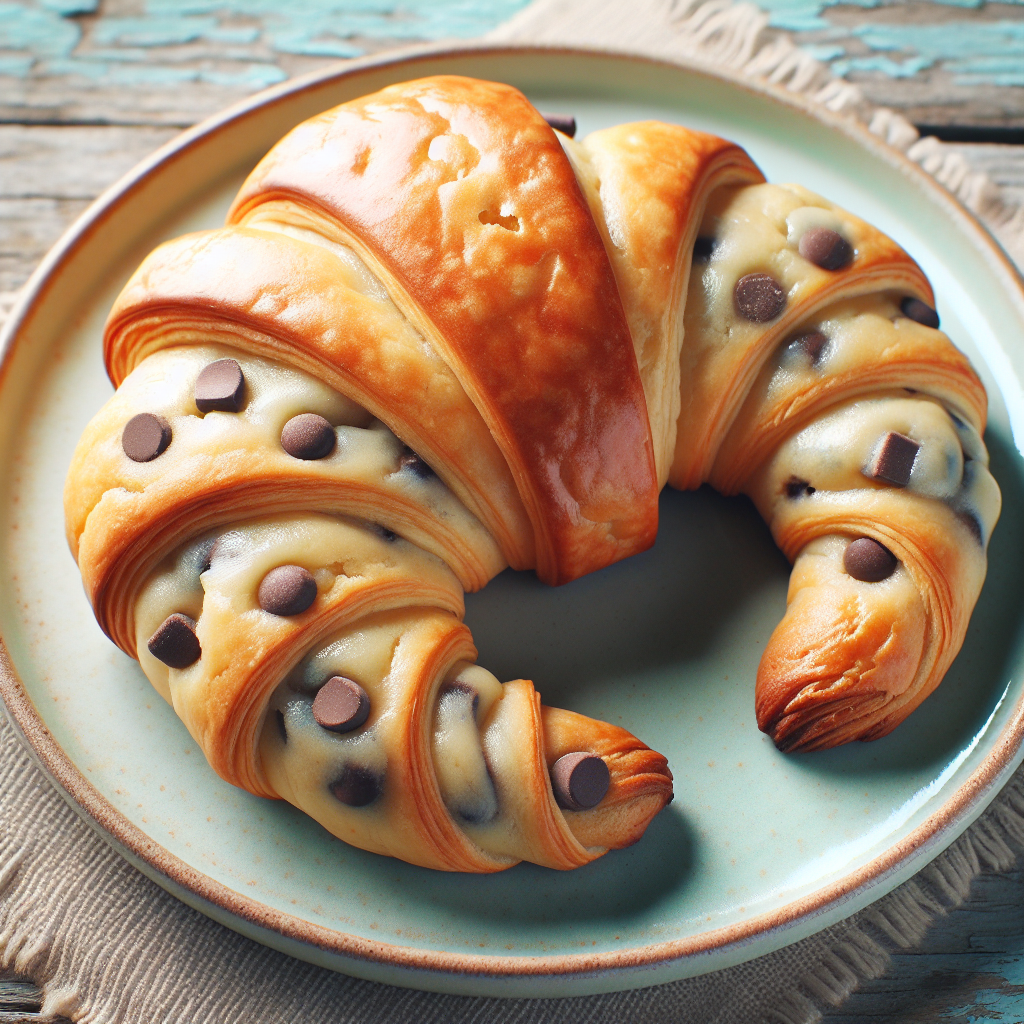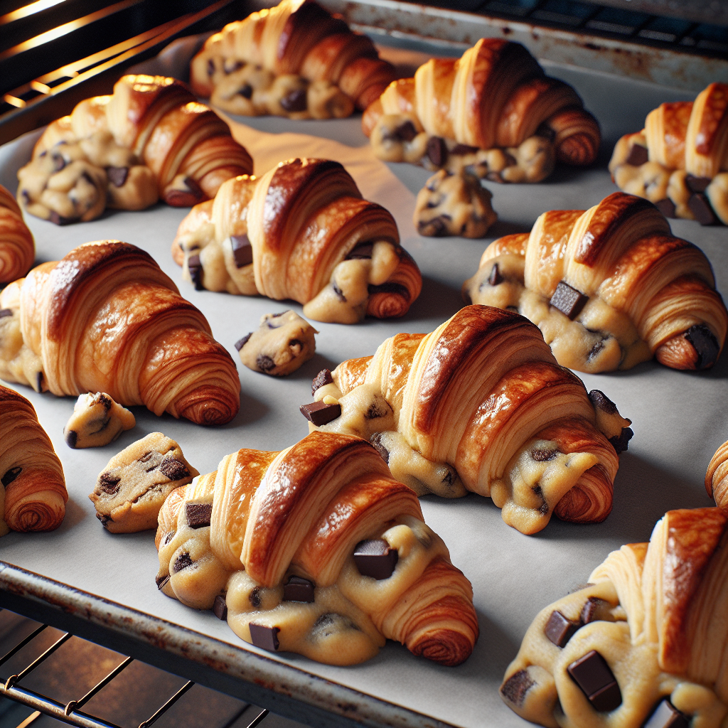 Prompt: Here is a recipe: Preheat oven or air fryer. Homemade crookies can be baked either in the oven or in the air fryer, depending on your own preferences. The temperature is gonna be slightly different, 350°F (180°F) for oven and 320°F (160°C) for air fryer. Stuff croissant with cookie dough. Slice each butter croissant into two halves, then fill with about 2 to 3 pieces of cookie dough inside. Close and top some more cookie dough.Bake cookie croissants. Line your viral Crookies over a parchment paper covered baking sheet, spacing them apart. Bake in hot oven for 8 to 12 minutes. Generate what the outcome of my baked good would look like.